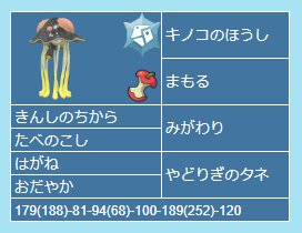 そんな中、知人が胞子寄生木身代わり@1の残飯リククラゲ構築で遊んでいる様子を見てこのポケモンならランクバトルで使っても良さそうだと思い、今期はリククラゲと心中することにしました。
