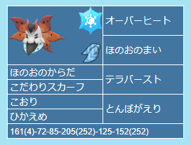 クエスパトラとポリゴン2を強く意識して隠密マント、アーマーガアとウルガモスに勝てるよう炎テラスになりました。
